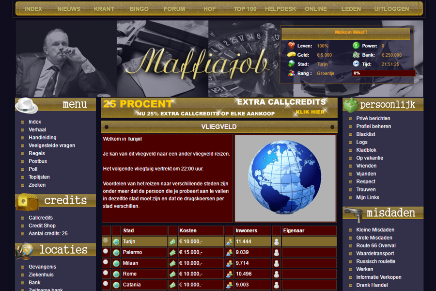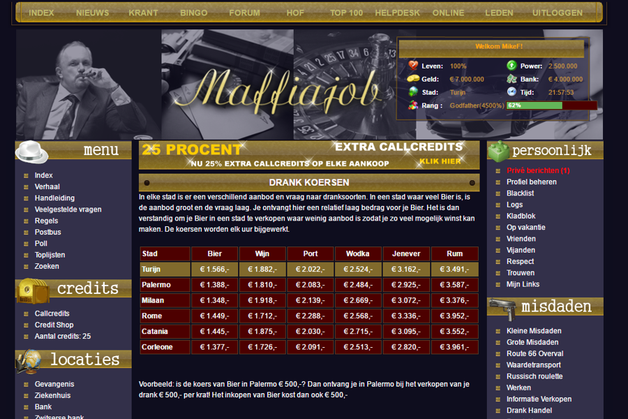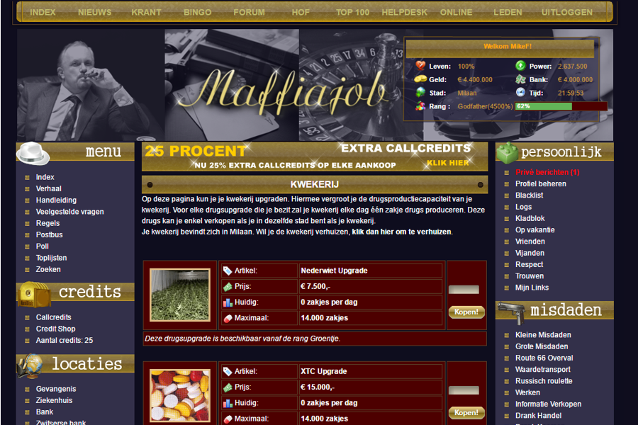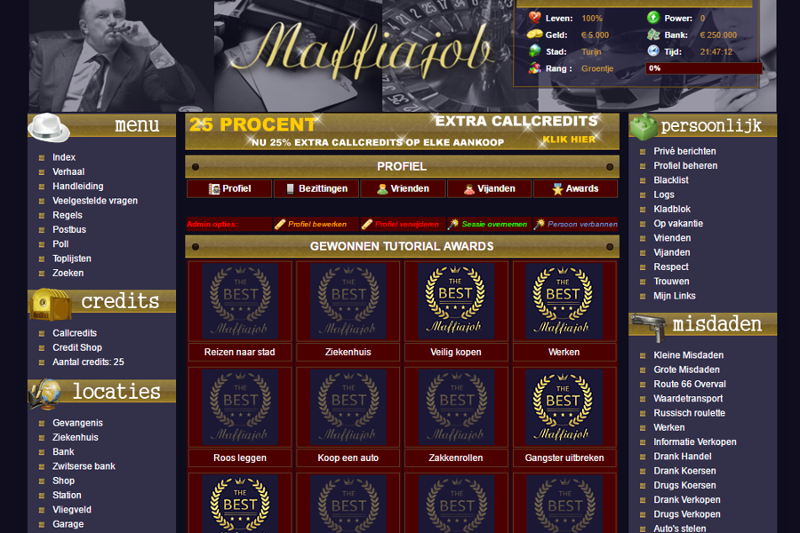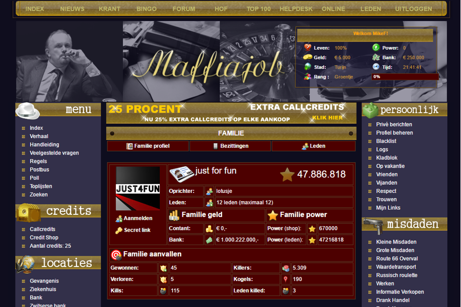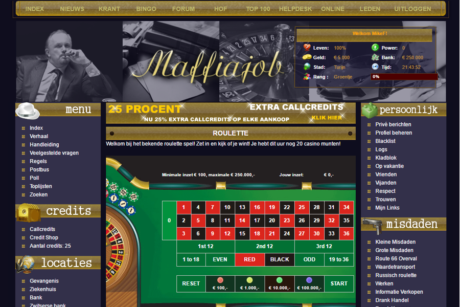 Neem zelf een plaats in de maffia wereld en werk je van groentje naar misschien wel de hoogste en meest gerespecteerde godfather. Weet jij genoeg inkomsten binnen te halen door misdaden te plegen? Of ben je beter in het handelen van drugs? Stap in de maffia wereld van wraak en respect en wie weet heb jij straks een hele familie onder je!